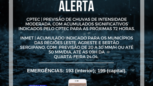 O Departamento Estadual de Proteção e Defesa Civil da Secretaria de Estado da Inclusão, Assistência Social e do Trabalho (Depec/Seit) alerta para a ocorrência de chuvas de intensidade moderada, com acumulados significativos nas próximas 72 horas, com previsão de 20 a 30 mm/h ou até 50 mm/dia até as 09h desta quarta-feira (24). Segundo boletins enviados pelo Centro de Previsão de Tempo e Estudos Climáticos (CPTEC) e pelo Instituto Nacional de Meteorologia, são indicados municípios das regiões Leste, Agreste e Sertão Sergipano, perfazendo um total de 67 municípios, com baixo risco de alagamentos e pequenos deslizamentos.