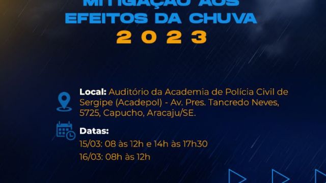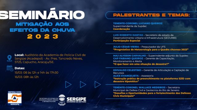 Preparar agentes e coordenadores que atuam com a proteção e defesa civil dos municípios sergipanos para o período da quadra chuvosa, que compreende os meses de maio, junho, julho e agosto. Este é o objetivo do Governo de Sergipe ao promover o seminário ‘Mitigação aos Efeitos das Chuvas 2023?, nos dias 15 e 16 de março, das 8h às 12h e das 14h às 17h30, e das 8h às 12h30, respectivamente, no auditório da Academia de Polícia Civil (Acadepol), localizado na avenida Tancredo Neves, nº 5725, em Aracaju.