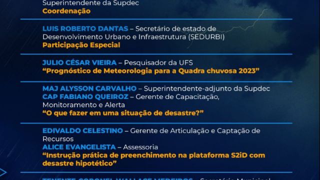 “Por intermédio deste evento, levaremos informações para todo o estado, principalmente para os territórios sul e leste, grande Aracaju e o município de Itabaiana, no agreste, que mais sofrem com as chuvas”, informou o superintendente tenente-coronel Luciano Queiróz.